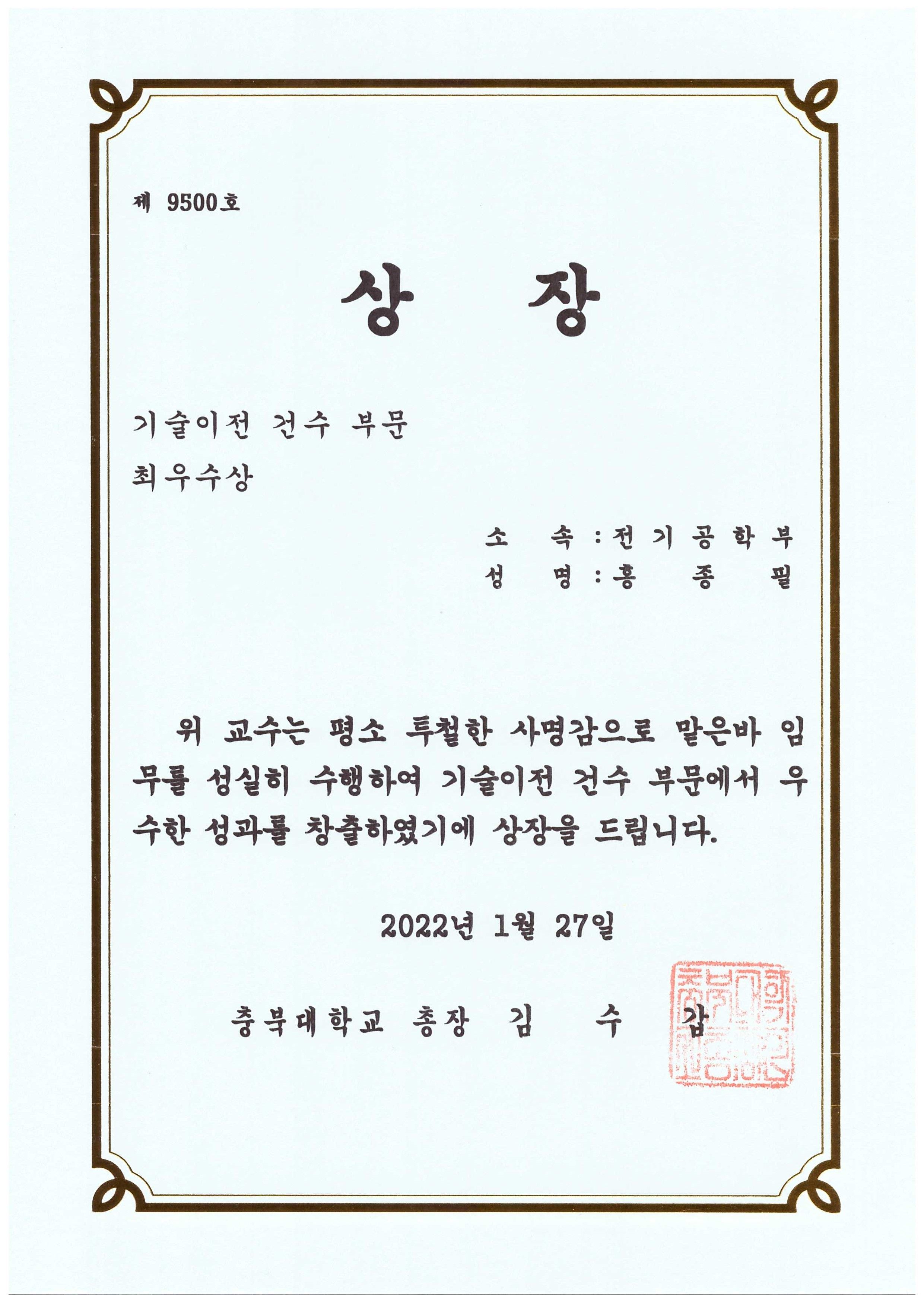 홍종필 교수님 충북대학교 기술이전 부문 최우수상 수상
