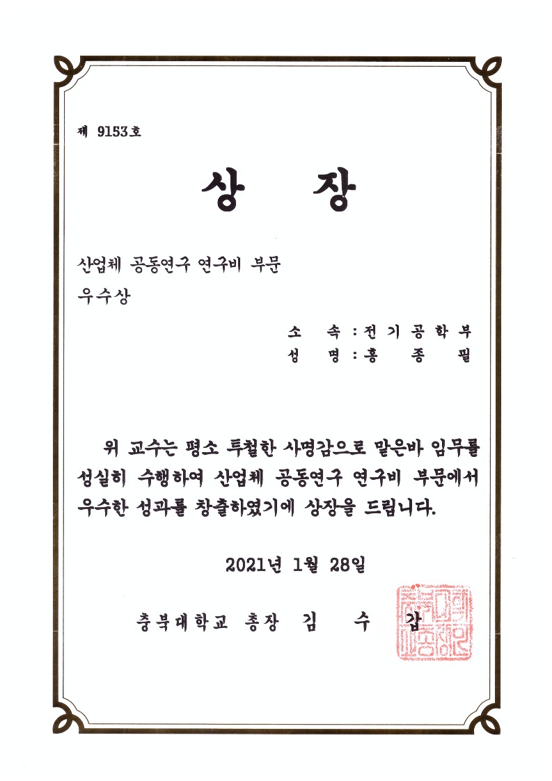홍종필 교수님께서 공동연구 부문, 기술이전 부문에서 훌륭한 성과를 창출하시어 2년 연속 상장을 수상하셨습니다.